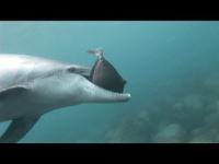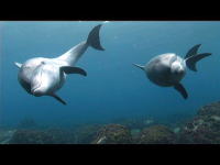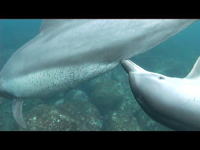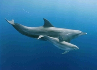 Dolphins nurse thir baby while they swim. |
