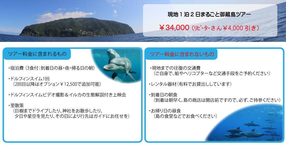 | ※ 上記表示料金は全て税込み価格です。 ※ 小学生以下は、ツアー料金、延泊料金ともに1,000円引きです。ドルフィンスイムなどのアクティビティやレンタル料金の割引はありません。 ※ 2歳以下のお子様は無料です。 ※ お支払いは、現金/クレジットカード((VISA, Mastercard, American Express, JCB、Diners Club、Discover)/PayPay/交通系ICカードが使えます。 ※ 宿は、男女別の相部屋になる可能性がありますので、あらかじめご了承ください。 ※ 当日、天候等の事情により、アクティビティ内容のやサービスの変更・中止などをする場合がございます。 この場合やお客様の都合により参加されない場合は、ツアー代の返金は行っておりませんので、あらかじめご了承ください。 ただし、ドルフィンスイムが中止になった場合は、その分(¥12,500)を返金いたします。 *キャンセル料について* 自己都合(病気・怪我も含む)で2週間前以降にツアーをキャンセルされた場合、キャンセル料は10,000円となります。 ただし、東海汽船欠航によるキャンセルの場合、キャンセル料はかかりません。 *お申込み金について* 4名様以上のお申込みについては、お1人様10,000円(内金)をご入金頂き、お申込み完了となります。 自己都合(病気・怪我も含む)で2週間前以降にツアーをキャンセルされた場合、内金をキャンセル料としていただきます。 ただし、東海汽船欠航によるキャンセルの場合、内金は返金いたします。 |